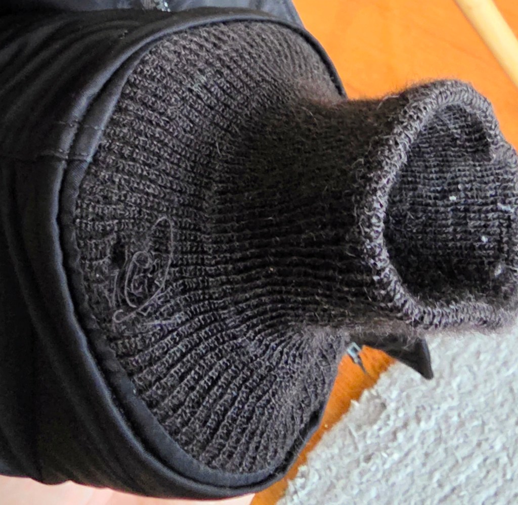 A little hole in the two-ply 100% worsted wool knit cuff.