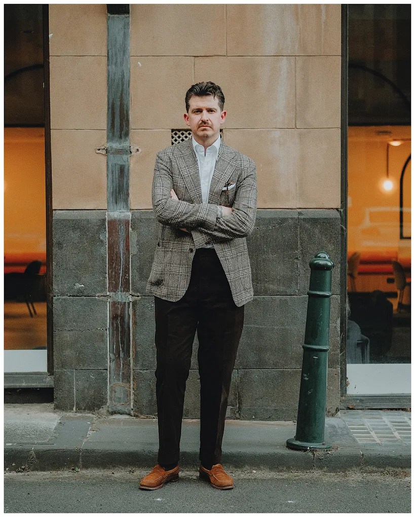 Stepping back into the jumble of Flinders Lane, you take a deep breath, wondering if the whole experience has been some kind of phantasm. To some degree, to walk into the Nicholas Building and The Revere, is to walk both into and out of time, liberated from the CBD–the rush, crush, honking din–by a stiller, calmer, more deliberate arrangement of the things that lend Melbourne its character, if not charm. Snathes of idle conversation and bluetooth phonecalls rise and clash. Delivery cyclists swerve. As a relatively young city, Melbourne’s past is less about its stone edifices and more about the people you walk past or work within them on a daily basis. The famous laneways and arcades are beautiful, yes, but they are beautified by the graffiti artists, cafe owners, and store holders who convert the grid of urban passages into a twill of meetings, encounters, brunches, memories, and relationships. And this is what you carry away in The Revere’s garment bag and what you inhabit when you wear and re-wear its tailoring.