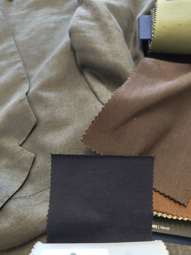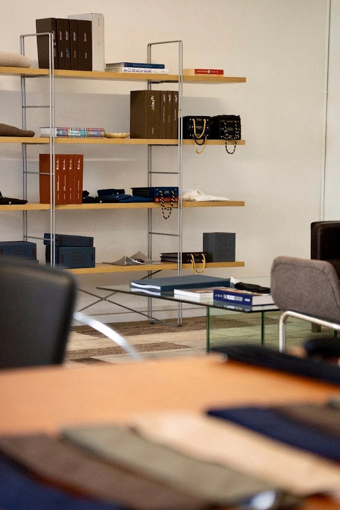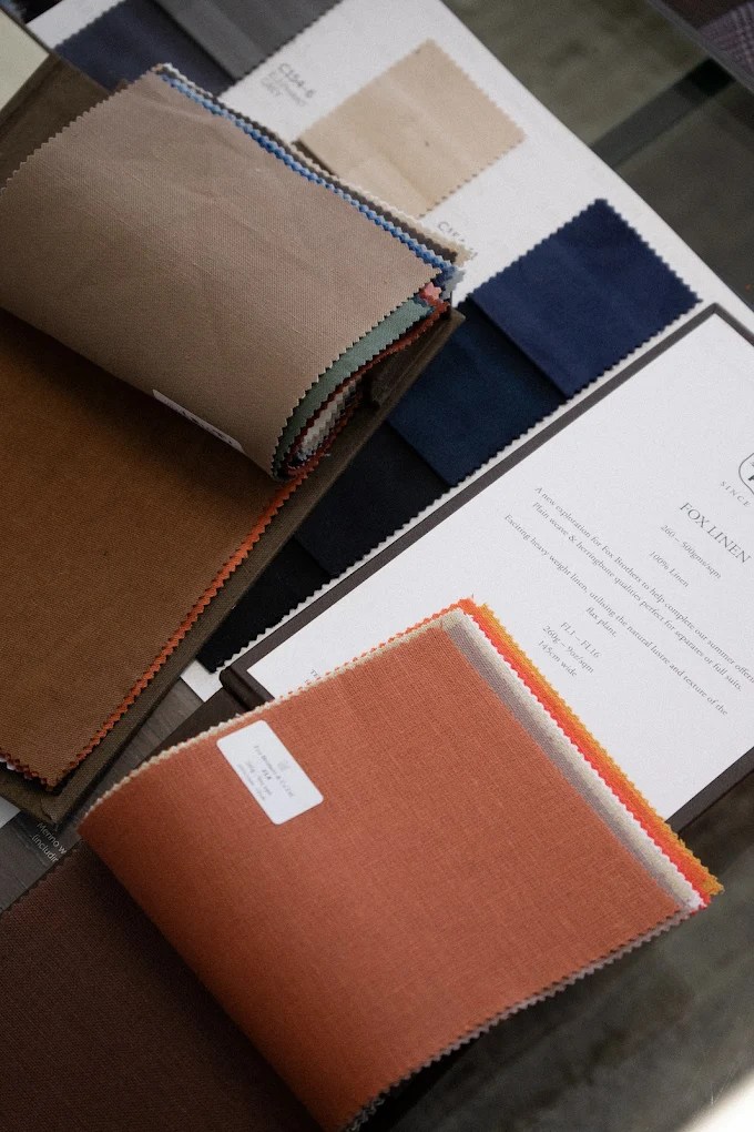 Beyond the first room, The Revere opens into large fitting room replete with plush couches and a shelf heavy with fabric swatch books. Sitting down, you lay the olive green linen jacket you’ve brought on a low coffee table, outlining your need for a shirt and trousers for an upcoming wedding. You want sharp, smart, but casual, wondering about the applicability of complimentary earth tones. Nodding, Steve pulls several swatch books from a nearby shelf.